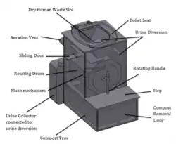 A composting toilet consists of two elements: a place to sit or squat and a collection/composting unit.[3] The composting unit consists of four main parts:[2]