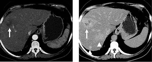 The late arterial phase is timed to correspond to the peak concentration of contrast material in highly vascular tumors and is performed approximately 20–35 seconds after the injection of intravenous contrast. Early arterial phase imaging is predominantly utilized for angiography and will be discussed separately. Late arterial phase imaging is almost always performed in conjunction with other phases (e.g. portal venous phase) to allow more complete characterization of any identified abnormalities (figure 4). The primary indication for a late arterial phase is for the evaluation of hypervascular tumors of the liver such as hepatocellular carcinoma or hypervascular metastases (figure 4). Typical hypervascular tumors for which this would be used include: hepatocellular carcinoma; renal cell carcinoma; melanoma; carcinoid/neuroendocrine tumors; some sarcomas; choriocarcinoma; and thyroid carcinoma. Although a "hypervascular", biphasic evaluation would generally be used for these patients, note that a single phase is often adequate for follow up imaging.