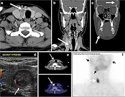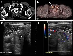 - ↑ Salvatori, M.; Melis, L.; Castaldi, P.; Maussier, M. L.; Rufini, V.; Perotti, G.; Rubello, D. (September 2007). "Clinical significance of focal and diffuse thyroid diseases identified by (18)F-fluorodeoxyglucose positron emission tomography". Biomedicine & Pharmacotherapy. 61 (8): 488–493. doi:10.1016/j.biopha.2007.05.001. ISSN 0753-3322. PMID 17604940.