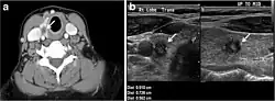 Fig. 7. A 51-year-old female patient post total thyroidectomy for PTC with elevated thyroglobulin measurement. an Axial non-enhanced CT scan of the neck at the level of the thyroid bed demonstrates a well-defined, rounded, homogenously dense soft tissue situated between the trachea and left internal jugular vein (white arrow). b Transverse ultrasound image of the neck demonstrates a well-defined, homogeneous, hypoechoic soft tissue nodule measuring 6 mm (white arrow) with no detected micro-calcifications. Biopsy showed a predominantly residual normal thyroid tissue with micro-foci of PTC.[1]