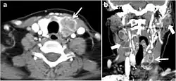 Fig. 11. Thyroid non-Hodgkin's large B-cell lymphoma in a 66-year-old female patient. an Axial enhanced neck CT scan demonstrates left thyroid lobe and isthmus homogeneously hypodense and minimally enhancing mass (white arrows). This lesion invades the prevertebral muscles (black arrows). Note the multiple enlarged level V lymph nodes (white arrowheads). b Post-treatment image shows significant reduction in size and mass effect of the left thyroid infiltrative mass, with almost complete resolution of the left cervical lymphadenopathy.[1]