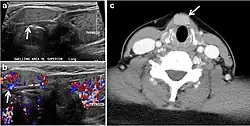 Fig. 19. Long-standing infected thyroglossal duct cyst in a 29-year-old male patient. a Transverse greyscale ultrasound at midline, just above the level of the thyroid gland, shows an oval cystic lesion with internal echoes (white arrows) and posterior enhancement (arrowheads). b Transverse colour Doppler ultrasound shows surrounding peripheral flow (white arrow). c Axial enhanced neck CT scan at the level of the thyroid cartilage demonstrates a slightly off-midline, well-defined, homogeneous cystic lesion embedded in the left strap muscle with peripheral enhancement (white arrow). It shows no calcification or internal enhancement. Thyroid gland was normal (not shown).[1]