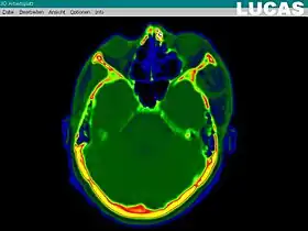 The most important component for CAS is the development of an accurate model of the patient. This can be conducted through a number of medical imaging technologies including CT, MRI, x-rays, ultrasound plus many more. For the generation of this model, the anatomical region to be operated has to be scanned and uploaded into the computer system. It is possible to employ a number of scanning methods, with the datasets combined through data fusion techniques. The final objective is the creation of a 3D dataset that reproduces the exact geometrical situation of the normal and pathological tissues and structures of that region. Of the available scanning methods, the CT is preferred,[1] because MRI data sets are known to have volumetric deformations that may lead to inaccuracies. An example data set can include the collection of data compiled with 180 CT slices, that are 1 mm apart, each having 512 by 512 pixels. The contrasts of the 3D dataset (with its tens of millions of pixels) provide the detail of soft vs hard tissue structures, and thus allow a computer to differentiate, and visually separate for a human, the different tissues and structures. The image data taken from a patient will often include intentional landmark features, in order to be able to later realign the virtual dataset against the actual patient during surgery. See patient registration.
