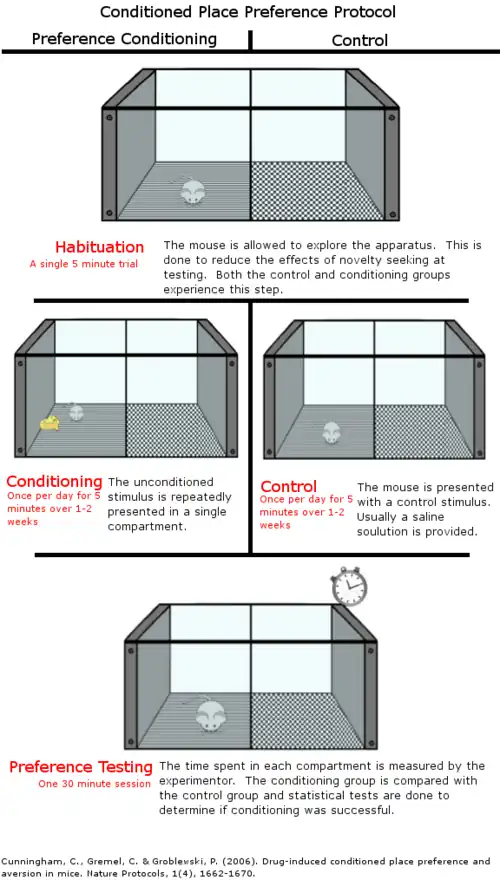 Conditioned place preference (CPP) is a form of Pavlovian conditioning used to measure the motivational effects of objects or experiences.[1] This motivation comes from the pleasurable aspect of the experience, so that the brain can be reminded of the context that surrounded the "encounter".[2] By measuring the amount of time an animal spends in an area that has been associated with a stimulus, researchers can infer the animal's liking for the stimulus.[3] This paradigm can also be used to measure conditioned place aversion (CPA) with an identical procedure involving aversive stimuli instead. Both procedures usually involve mice or rats as subjects.[4][5][6] This procedure can be used to measure extinction and reinstatement of the conditioned stimulus. Certain drugs are used in this paradigm to measure their reinforcing properties. Two different methods are used to choose the compartments to be conditioned, and these are biased vs. unbiased. The biased method allows the animal to explore the apparatus, and the compartment they least prefer is the one that the drug is administered in and the one they most prefer is the one where the vehicle (without the drug) is injected.[7] This method allows the animal to choose the compartment they get the drug and vehicle. In comparison, the unbiased method does not allow the animal to choose what compartment they get the drug and vehicle in. Instead, the researcher chooses the compartments.[7]