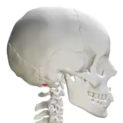 Skull and cervical vertebra. Position of condyloid fossa shown in red.