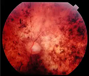 | Fundus of a 34-year-old patient with cone rod dystrophy due to Spinocerebellar Ataxia Type 7 (SCA7). Note that the macular area, and also the mid periphery, are atrophic. | |