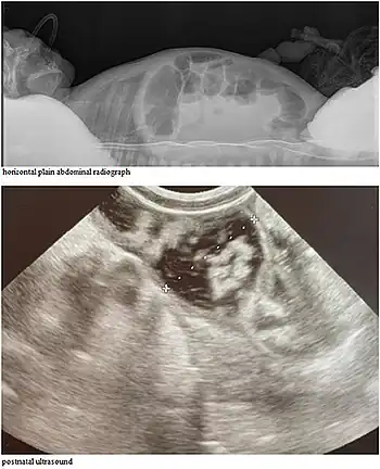 Abdominal ultrasound exam shows significantly distended intestinal loops of newborn