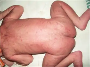 It may present as generalized red patches and small bumps on the skin, appearing at birth or a few days after birth.[3][2] There may be inflammed eyes, lung infection, and the baby may have swollen vagina and vulva.[3] It can also occur as a more serious widespread disseminated type.[3]