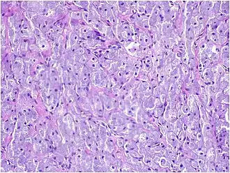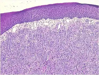 - Sheets of proliferating polygonal to round cells with overlying thin squamous, eosinophilic, granular cytoplasm[12][13]