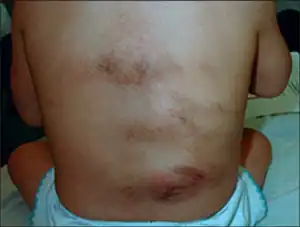Congenital smooth muscle hamartoma is typically a skin colored or lightly pigmented patch or plaque with hypertrichosis.[1]: 627 [2]
