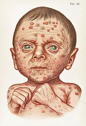 Congenital syphilis is syphilis that occurs when a mother with untreated syphilis passes the infection to her baby during pregnancy.[1] It may be detected in the unborn baby as poor growth, excessive fluid leading to premature birth, or loss of the baby; though some have no signs.[2][8] Features vary widely and may be divided into whether they present before or after age 2-years.[1] Typically there are no signs in the first few weeks of life; though babies may be small and irritable.[1] Features may include fever, rash, large liver and spleen, runny nose, or bone or joint pain.[1][4] There may be yellowish skin and eyes, large glands, pneumonia, meningitis, warty bumps on genitals, deafness, or blindness.[1][5] Untreated babies that survive may develop deformities of the nose, lower legs, forehead, collar bone, jaw, or cheek bone.[1] There may be a perforated or high arched palate, joint disease, and intellectual disability.[1][4] Seizures and cranial nerve palsies may occur in both early and late phases.[1]