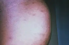 The rash in a newborn is a prominent feature.[1] It may appear as light coloured patches on the legs and face, dark spots on the soles of feet, small bumps around the mouth, or widespread peeling skin with blisters.[1]