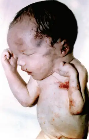 | Stillborn baby with scarring of the left chest, armpit, and upper arm due to a varicella infection at 13 to 15 weeks gestational age.[3] | |