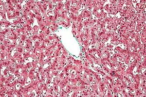 Macroscopically, the liver has a pale and spotty appearance in affected areas, as stasis of the blood causes pericentral hepatocytes (liver cells surrounding the central venule of the liver) to become deoxygenated compared to the relatively better-oxygenated periportal hepatocytes adjacent to the hepatic arterioles. This retardation of the blood also occurs in lung lesions, such as chronic interstitial pneumonia, pleural effusions, and intrathoracic tumors.