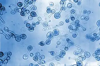 Conidiobolus coronatus produces forcibly discharged sporangia, which show phototropic orientation.[5][6] Phototropic orientation aims growth and spore dispersal towards the most intense light source, thereby increasing the efficiency of dispersal.[3] This orientation towards the most intense light source can also be seen as a survival mechanism for the fungus as it increases the possibility that the sporangia will be dispersed in the least obstructed direction and to the greatest distance.[3] The forcible discharge is affected by the size of the spore, with smaller secondary spores being discharged to greater distances and therefore having a greater chance at becoming air borne and landing on a medium that is nutritionally favourable for fungal growth.[7] The growing zone of C. coronatus shows a light-mediated reorganization, with a weakness and thinning of the cell wall being seen in the area of future growth.[3] Both primary and secondary spores of C. coronatus show phototropic orientation, however it is imprecise and becomes increasingly imprecise the greater the lights' angle of incidence.[3] Upon further observation of the imprecise phototropic orientation, it can be seen that the sporangia seem to aim their dispersal above the source of light, which may be a compensation mechanism to assure that the fungus has the ability to disperse at the greatest possible distance, while maintaining its dispersal orientation towards the light.[3] Though the fungus shows phototropic orientation, albeit imprecise, the formation and discharge of secondary spores is shown to occur in darkness as well, however it seems to always requires high moisture levels.[3][7]