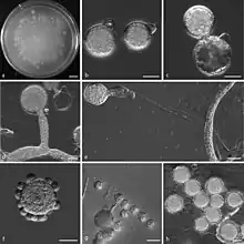 Secondary dispersal through the formation of secondary spores is a survival mechanism exhibited by C. coronatus.[3] This mechanism consists of the first spore producing a secondary spore if it lands on a nutritionally unfavourable medium, this secondary spore then gets discharged onto a different spot on the medium, or onto a completely different medium, in hopes of greater nutrient availability.[3] These secondary, replicative spores are globose and elongate in physiology.[7] Once the spore has been discharged, all subsequent developmental events are triggered, including germination.[3] Sporangial germination, either through secondary spore formation or vegetative germ tube formation, seems to be increasingly dependent on the time elapsed since discharge, rather than on the external environmental factors, however these external factors do still play a role.[3] The spores formed by C. coronatus during asexual reproduction are globose, villose and multiplicative in some isolates, and have at least seven nuclei per spore.[5] This presence of villose and multiplicative spores is what differentiates C. coronatus from the genus Entomophthora.[5] Though C.coronatus is classified under Zygomycota, it does not produce zygospores and therefore does not undergo sexual reproduction.[5]
