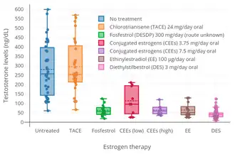 - ↑ 61.0 61.1 61.2 Shearer RJ, Hendry WF, Sommerville IF, Fergusson JD (December 1973). "Plasma testosterone: an accurate monitor of hormone treatment in prostatic cancer". Br J Urol. 45 (6): 668–77. doi:10.1111/j.1464-410x.1973.tb12238.x. PMID 4359746.