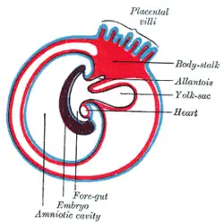 The root of the connecting stalk contains the allantois as a diverticulum of hindgut endoderm along with umbilical vessels.[5][2]