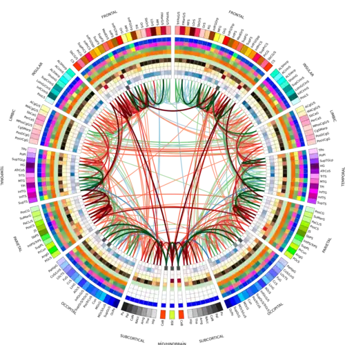 With the recent concerted push to map all of the human brain and its connections,[8][9] it has become increasingly important to find ways to graphically represent the large amounts of data involved in connectomics. Most other representations of the connectome use 3 dimensions, and therefore require an interactive graphical user interface.[1] The connectogram can display 83 cortical regions within each hemisphere, and visually display which areas are structurally connected, all on a flat surface. It is therefore conveniently filed in patient records, or to display in print. The graphs were originally developed using the visualization tool called Circos.[10][11]