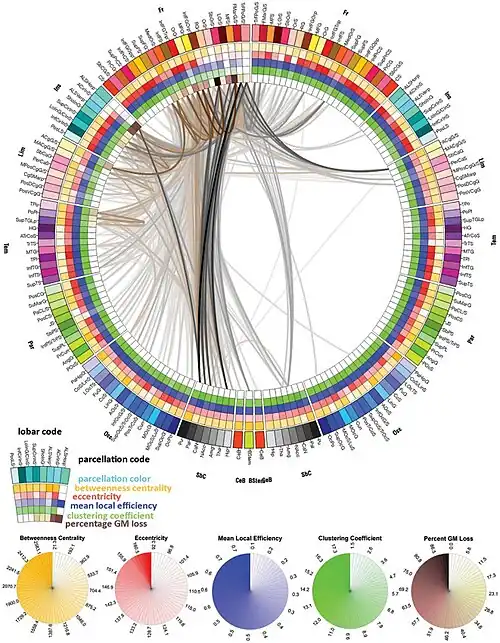 There are many possibilities for which measures are included in the rings of a connectogram. Irimia and Van Horn (2012) have published connectograms which examine the correlative relationships between regions and uses the figures to compare the approaches of graph theory and connectomics.[17] Some have been published without the inner circles of cortical metrics.[18] Others include additional measures relating to neural networks,[19] which can be added as additional rings to the inside to show metrics of graph theory, as in the extended connectogram here: