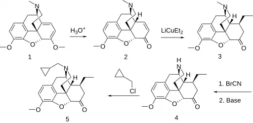Exposure of thebaine (1) to mild acid leads to hydrolysis of the enol ether function, followed by migration of the double bond to yield the conjugated enone (2). Addition of lithium diethylcuprate proceeds by 1,4-addition from the less hindered side to give the intermediate (3). Treatment of that with cyanogen bromide under von Braun reaction conditions leads to the isolable aminocyanide. This is the converted to the secondary amine (4) by treatment with aqueous base. Alkylation of that intermediate with cyclopropylmethyl chloride yields the analgesic codorphone.[3]