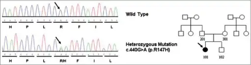 Pedigree/DNA sequencing showed a heterozygous mutation c. 440G > p.R147H in EBP gene