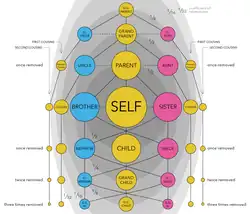 Diagram of common family relationships, where the area of each colored circle is scaled according to the coefficient of relatedness. All relatives of the same relatedness are included together in one of the gray ellipses. Legal degrees of relationship can be found by counting the number of solid-line connections between the self and a relative.