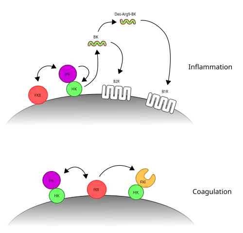 - ↑ Schmaier, AH (January 2016). "The contact activation and kallikrein/kinin systems: pathophysiologic and physiologic activities". Journal of Thrombosis and Haemostasis. 14 (1): 28–39. doi:10.1111/jth.13194. PMID 26565070.