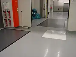 Polymer mats are particularly effective due to their suppleness[4] as they allow for more contact with serrations on shoes and wheels and can accommodate more particles while still remaining effective. An electrostatic potential adds to the effectiveness of this type of contamination control as it enables particles to be retained until the flooring is cleaned. This method of attracting and retaining particles is more effective than mats with an active adhesive coating which needs to be peeled and is often not as supple.[5][6] As long as the tack level of the mat is greater than the donor's (such as a foot or a wheel), the contamination touching the surface will be removed. Very high tack surfaces pose a contamination threat because they are prone to pulling off overshoe protection.[7] Polymeric flooring is produced to ensure a higher level of tackiness than the surfaces it comes into contact with, without causing discomfort and potentially damaging 'stickiness'.