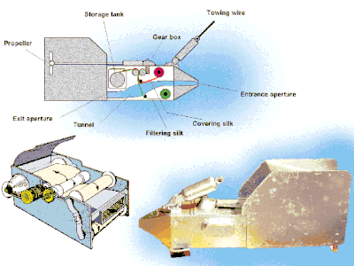 The CPR is towed at a depth of approximately 10 metres. Water passes through the CPR and plankton are filtered onto a slow-moving band of silk (270 micrometre mesh size) and covered by a second silk. The silks and plankton are then spooled into a storage tank containing formalin. On return to the laboratory, the silk is removed from the mechanism and divided into samples representing 10 nautical miles (19 km) of tow.