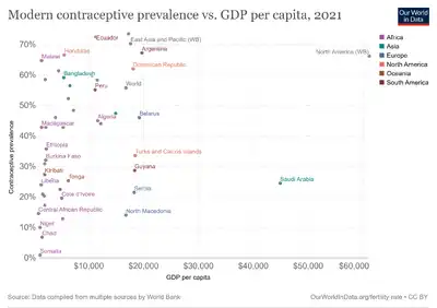Contraceptive use among women in Sub-Saharan Africa has risen from about 5% in 1991 to about 30% in 2006.[7] However, due to extreme poverty, lack of access to birth control, and restrictive abortion laws, many women still resort to clandestine abortion providers for unintended pregnancy, resulting in about 3% obtaining unsafe abortions each year.[8][9] South Africa, Botswana, and Zimbabwe have successful family planning programs, but other central and southern African countries continue to encounter extreme difficulties in achieving higher contraceptive prevalence and lower fertility for a wide variety of compounding reasons.[10]