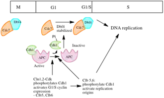 A two-step mechanism ensures that DNA is replicated only once per cycle. Assembly of the pre-RC complex (licensing) is limited to late mitosis and early G1 because it can occur only when CDK activity is low, and APC activity is high. Origin firing occurs only in S phase, when the APC is inactivated, and CDKs are activated.[1]