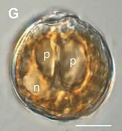 Sexual reproduction occurs as gametes begin to form in the population; this is an irreversible transition.[5] Gametes move around each other rapidly and then align laterally, forming gamete pairs with the girdle and sulcus contacting each other, forming a fertilization bridge.[5] A planozygote is formed when the cells stop moving and the fertilization bridge disappears, allowing the two nuclei to join together. This indicates that karyogamy has occurred.[5] The theca then begins to develop and the cell becomes motile.[5] As the planozygote matures, it shrinks and becomes immobile, eventually developing into a cyst.[5] The cyst further develops to contain a single nucleus that makes up much of the volume of the cell.[5] At the end of the process, meiosis occurs.[5] The sexual life cycle is thought to last approximately 2 months.[5]