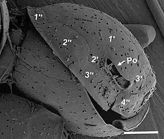 Coolia has plates covering the thecal surface that have an irregular pattern and are various sizes.[8][4][12] In most species, the thecal surface contains intercalary bands and is smooth and covered with large thecal pores that are round and ovoid.[5][4][10] Another distinguishing feature to identify Coolia is a plate on the epitheca that is off centred and contains an apical pore complex with a long, curved pore that has a slit containing two costae.[5] This apical pore is often visible because of its large size.[5] Coolia also has an ellipsoidal-shaped ventral pore on the ventral surface.[5]