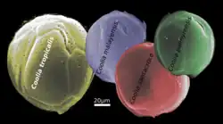 Coolia is a marine dinoflagellate genus in the family Ostreopsidaceae. It was first described by Meunier in 1919.[1] There are currently seven identified species distributed globally in tropical and temperate coastal waters.[2] Coolia is a benthic or epiphytic type dinoflagellate: it can be found adhered to sediment or other organisms but it is not limited to these substrates.[3] It can also be found in a freely motile form in the water column.[3][4] The life cycle of Coolia involves an asexual stage where the cell divides by binary fission and a sexual stage where cysts are produced.[5] Some of the species, for example, Coolia tropicalis and Coolia malayensis, produce toxins that can potentially cause shellfish poisoning in humans.[6]