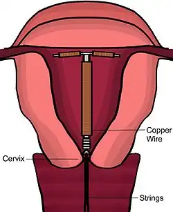 Copper intrauterine device, also known as intrauterine device (IUD) with copper and intrauterine coil, is a type of intrauterine device which contains copper.[5] It is used for birth control and emergency contraception within five days of unprotected sex.[5] It is one of the most effective forms of birth control with a one-year failure rate around 0.7%.[7] The device is placed in the uterus and lasts up to twelve years.[5][2][8] It may be used by women of all ages regardless of whether or not they have had children.[9] Following removal, fertility quickly returns.[2]