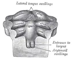 The copula linguae or copula, is a swelling that forms from the second pharyngeal arch, late in the fourth week of embryogenesis.[1] During the fifth and sixth weeks the copula becomes overgrown and covered by the hypopharyngeal eminence which forms mostly from the third pharyngeal arch and in part from the fourth pharyngeal arch.[1]