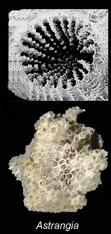 A corallite is the skeletal cup, formed by an individual stony coral polyp, in which the polyp sits and into which it can retract. The cup is composed of aragonite, a crystalline form of calcium carbonate, and is secreted by the polyp. Corallites vary in size, but in most colonial corals they are less than 3 mm (0.12 in) in diameter.[1] The inner surface of the corallite is known as the calyx. The vertical blades inside the calyx are known as septa and in some species, these ridges continue outside the corallite wall as costae.[2] Where there is no corallite wall, the blades are known as septocostae. The septa, costae and septocostae may have ornamentation in the form of teeth and may be thick, thin or variable in size. Sometimes there are paliform lobes, in the form of rods or blades, rising from the inner margins of the septa. These may form a neat circle called the paliform crown. The septa do not usually unite in the centre of the corallite, instead they form a columella, a tangled mass of intertwined septa, or a dome-shaped or pillar-like projection. In the living coral, the lower part of the polyp is in intimate contact with the corallite, and has radial mesenteries between the septa which increase the surface area of the body cavity and aid digestion. The septa, palliform lobes and costae can often be seen through the coenosarc, the layer of living tissue that covers the coenosteum, the part of the skeleton between the corallites.[3][4]