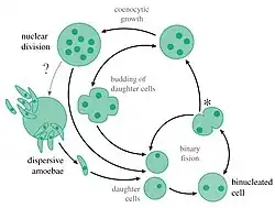 - ↑ Ruiz-Trillo, Iñaki; Donachie, Stuart; Sitjà-Bobadilla, Ariadna; Roger, Andrew J.; Paley, Richard; Nichols, Krista M.; Whipps, Christopher M.; Pérez-Cordón, Gregorio; Eme, Laura (2015-09-21). "Phylogenomics Reveals Convergent Evolution of Lifestyles in Close Relatives of Animals and Fungi". Current Biology. 25 (18): 2404–2410. doi:10.1016/j.cub.2015.07.053. ISSN 0960-9822. PMID 26365255.