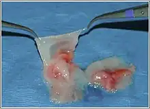 Dissection of the umbilical cord to demonstrate the cord lining membrane (held up with forceps). Umbilical cord vessels and Wharton's Jelly have been dissected free.
