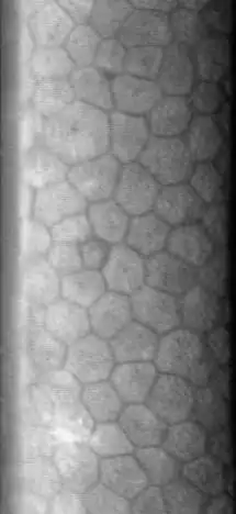 The normal corneal endothelium is a single layer of uniformly sized cells with a predominantly hexagonal shape. This honeycomb tiling scheme yields the greatest efficiency, in terms of total perimeter, of packing the posterior corneal surface with cells of a given area. The corneal endothelium is attached to the rest of the cornea through Descemet's membrane, which is an acellular layer composed mostly of collagen IV.