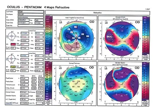 {{cite journal}}: CS1 maint: multiple names: authors list (link) - ↑ Rabinowitz YS, Rasheed K (October 1999). "KISA% index: a quantitative videokeratography algorithm embodying minimal topographic criteria for diagnosing keratoconus". Journal of Cataract and Refractive Surgery. 25 (10): 1327–35. doi:10.1016/S0886-3350(99)00195-9. PMID 10511930.