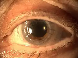 Cornea transplant after one year of healing, two stitches are visible