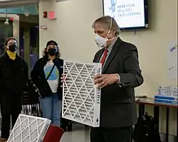Air purification units (room or multi-room) with HEPA filtration range widely in price from under $50 to considerably more than US$500.[12][13][11][14] Previous attempts to purify air with "DIY" box-like combinations of HEPA filters had been constructed in the past,[15][16] but there had never been an attempt to apply such a design to reduce the airborne load of viruses. In August 2020, Richard Corsi, an environmental engineer and the incoming Dean of Engineering at the University of California, Davis,[17] spoke with Wired reporter Adam Rogers about an idea he had for combining multiple store-bought filters with a box fan to improve the efficiency of home-made air filter designs.[11] Rogers contacted Jim Rosenthal, the CEO of filter manufacturer Tex-Air Filters, who had collaborated with Corsi at the University of Texas and in the Texas chapter of the Asthma and Allergy Foundation of America, to run some tests on a single air filter attached to a box fan.[2] Inspired by Corsi's idea to use multiple filters, Rosenthal later came up with a five-filter design. Rosenthal named it after Corsi,[2] although after a New York Times article mentioned the boxes by that name,[14] Corsi tweeted that Rosenthal really deserved the credit,[18] and that he preferred the name Corsi–Rosenthal Box.[19][20] HVAC experts Neil Comparetto and John Semmelhack modified the design in October 2020 to use 4 filters and a cardboard bottom, in a design called the Comparetto Cube.[21][22]