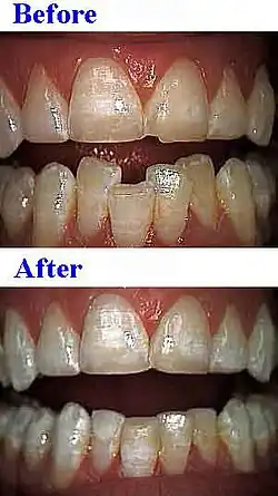Tooth reshaping removes parts of the enamel to improve the appearance of the tooth. It may be used to correct a small chip, or to alter the length, shape or position of teeth, as well as when there is tooth size discrepancy;[8][9] it can be used to correct crooked or excessively long teeth. The removed enamel is irreplaceable, and may sometimes expose dentin. It is also known as enameloplasty, odontoplasty, contouring, recontouring, cosmetic contouring, slenderizing, stripping. This procedure offers fast results and can even be a substitute for braces under certain circumstances.[10]
