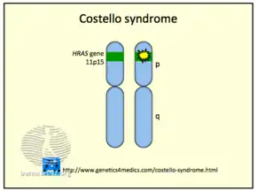 - ↑ Aoki, Y.; Niihori, T.; Kawame, H.; Kurosawa, K.; Ohashi, H.; Tanaka, Y.; Filocamo, M.; Kato, K.; Suzuki, Y.; Kure, S.; Matsubara, Y. (2005). "Germline mutations in HRAS proto-oncogene cause Costello syndrome". Nature Genetics. 37 (10): 1038–1040. doi:10.1038/ng1641. PMID 16170316. S2CID 22119631.