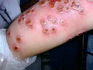 The rash typically begins as a flat mark before becoming a small bump, which fills with clear fluid and then yellow fluid, before becoming a dark hard crust.[4] It tends to be painful and becomes red and swollen.[4] It is typically accompanied by fever, swollen glands and fatigue, and may take 3-months to recover.[4]