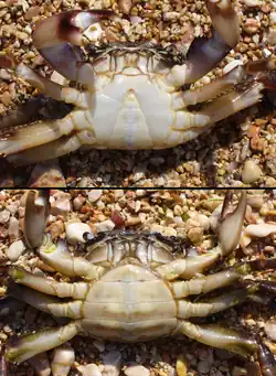 Crabs typically walk sideways[18] (hence the term crabwise), because of the articulation of the legs which makes a sidelong gait more efficient.[19] Some crabs walk forward or backward, including raninids,[20] Libinia emarginata[21] and Mictyris platycheles.[18] Some crabs, like the Portunidae and Matutidae, are also capable of swimming,[22] the Portunidae especially so as their last pair of walking legs are flattened into swimming paddles.[17]: 96