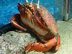 Crabs vary in size from the pea crab, a few millimeters wide, to the Japanese spider crab, with a leg span up to 4 m (13 ft).[6] Several other groups of crustaceans with similar appearances – such as king crabs and porcelain crabs – are false crabs, but have convergently evolved similar features to true crabs, making them good examples of carcinisation.[7][8][9][10]