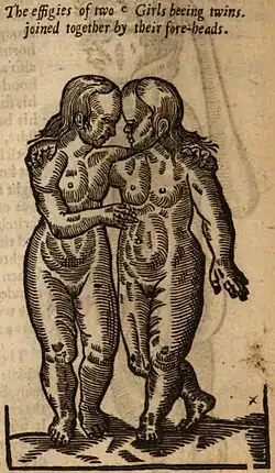 Apart from that, Sebastian Münster’s Cosmographia universalis provides the true first account of craniopagus twins who happened to live for ten years, exceeding many expectations during that time.[35] He describes the set of twins as being a unique malformation and a punishment from their mother's mistake. In French barber surgeon Ambroise Paré’s 16th-century book, On Monsters and Marvels, various types of "supernatural" twinning are illustrated and described as "monstrous and marvelous creatures that proceed from the judgment of God", suggesting that conjoined twins and specifically craniopagus twins were viewed as literal monsters in the 16th century.[36]